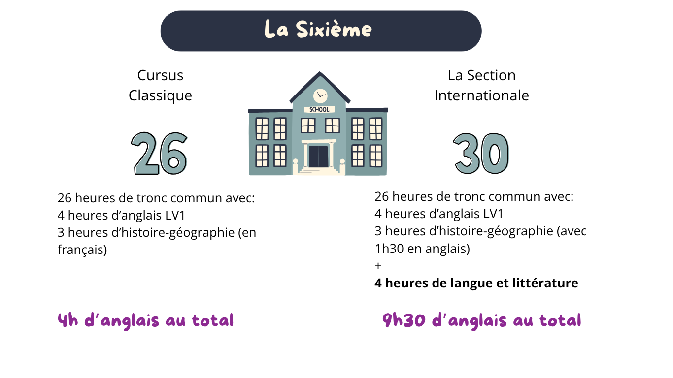 En 6eme, tous collégiens suivent 26 heures de cours par semaine. En section internationale s’ajoute 4 heures de lettres étrangères, soit un total de 30 heures d’enseignement par semaine.